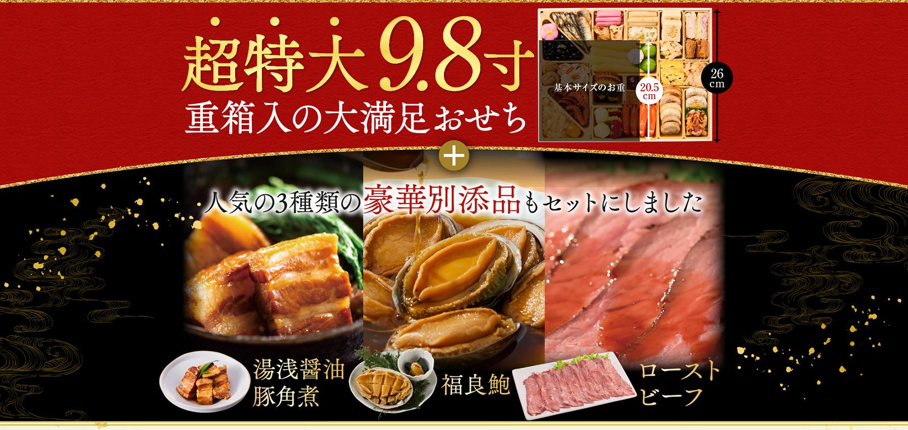 - 悪天候(積雪など)や交通事情による配達遅れを確実に防ぐため、また、おせちの解凍時間も考慮し、基本のお届け日は12月30日(火)になります。