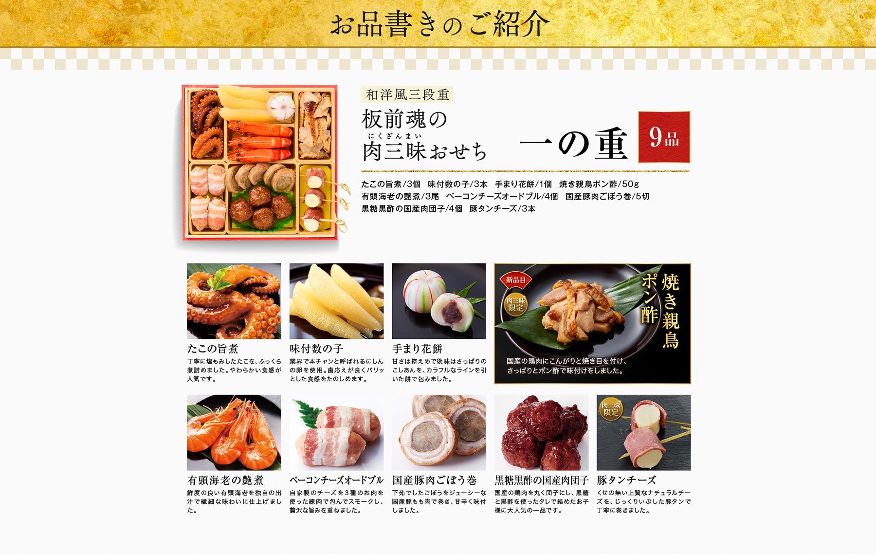 - 20.5cm×20.5cm×4.5㎝×3段 / 材質:PS樹脂 / お品書き、解凍・保存方法案内付き